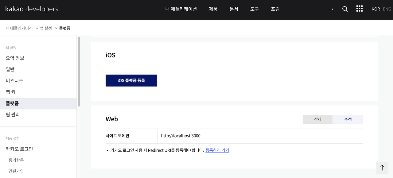 Redirect URI๋ ์นด์นด์ค ๋ก๊ทธ์ธ ๋ฉ๋ด์ ๋ค์ด๊ฐ์ ์ถ๊ฐ๋ฅผ ํด์ค๋ค. ์ด๋ ๊ฒฝ๋ก ์ค์ ์ ๋ฐฑ์๋์ ํ์ํด์ ๋ง์ถ๋ค.